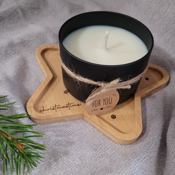 Das Dekotablett aus Bambusholz hat einen Durchmesser von etwa 15 cm.