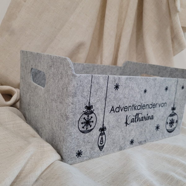 Die Adventkalenderkiste besteht aus Filz und ist zirka 31 x 25 x 15 cm groß. Sie kann jährlich beliebig befüllt werden.
